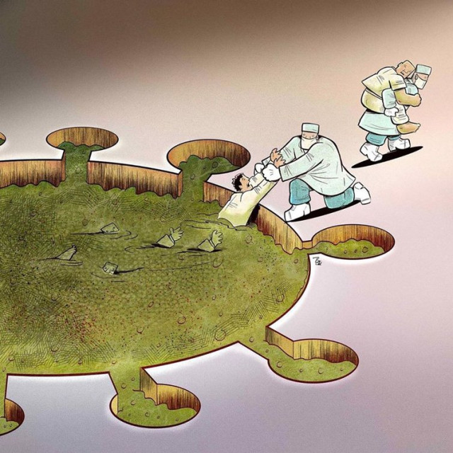 Іранський художник Аліреза Пакдел вирішив показати, з якими реаліями стикаються лікарі та інші люди під час пандемії коронавірусу.