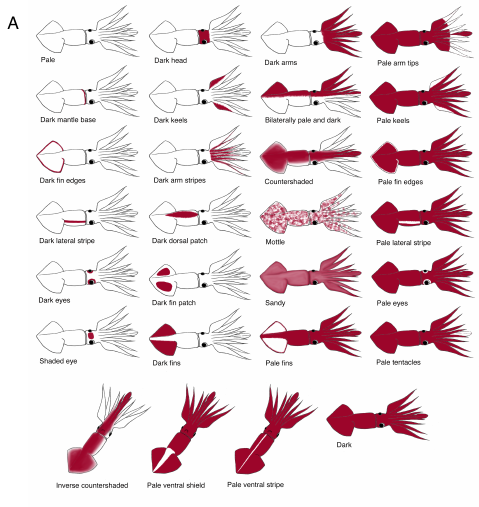 Дослідники виявили, що молюски видають послідовності світлових сигналів і поз, а не окремі не пов’язані між собою сигнали. Наприклад, при переслідуванні здобичі кальмар найчастіше спочатку стає темно-червоним, потім одна половина його тіла світліє.