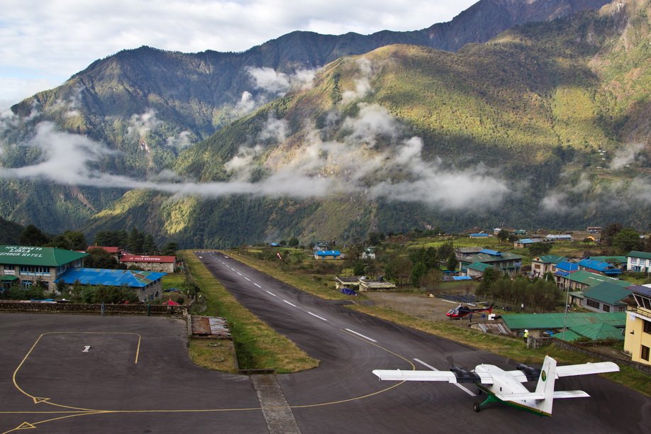 Аеропорт Тенцинг і Хілларі в Непалі називають головними воротами Евересту. Це дійсно екстремальне місце. Злітна смуга знаходиться на висоті трьох тисяч метрів. З одного боку вона обривається у безодню, з другого боку – скеля. Окрім того, вона ще надзвичайно коротка – усього 500 метрів, тому курсують тут тільки легкі літаки.