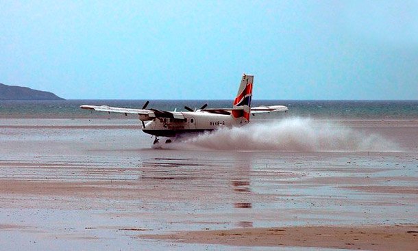 Аеропорт Барра у Шотландії розташований просто на пляжі. Це єдине у світі летовище, де розклад польотів розраховують за відпливами, адже у інший час смуга опиняється на дні бухти.