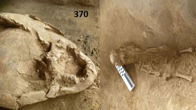 Проте два з них були дуже нетиповими. Так, у одному кургані учені відшукали череп немовляти (дитя померло, коли йому було усього 18 місяців), одягнутий у череп іншої дитини віком від 4 до 12 років. Між головою немовляти та «шоломом» розташовувалася також кістка пальця та мушля.