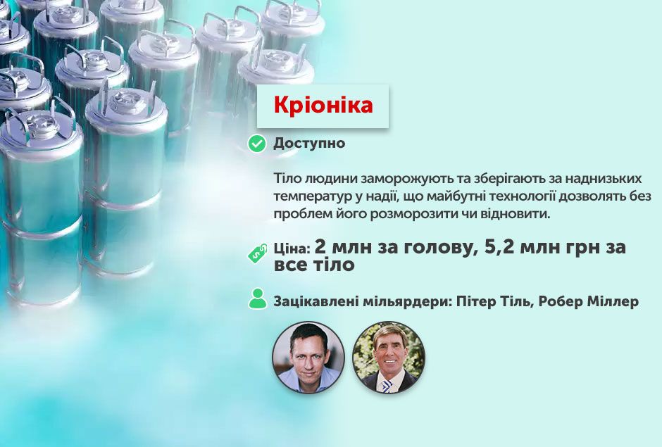 Американський бізнесмен та засновник платіжної системи PayPal Пітер Тіль надзвичайно підтримує кріоніку, судячи з його інвестицій в цю галузь.