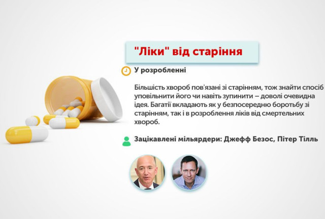 Чимало мільярдерів вкладаються в боротьбу з головним передвісником смерті – старінням. Так, Безос вклав гроші в каліфорнійську компанію Unity, яка розраховує зупинити процес старіння.