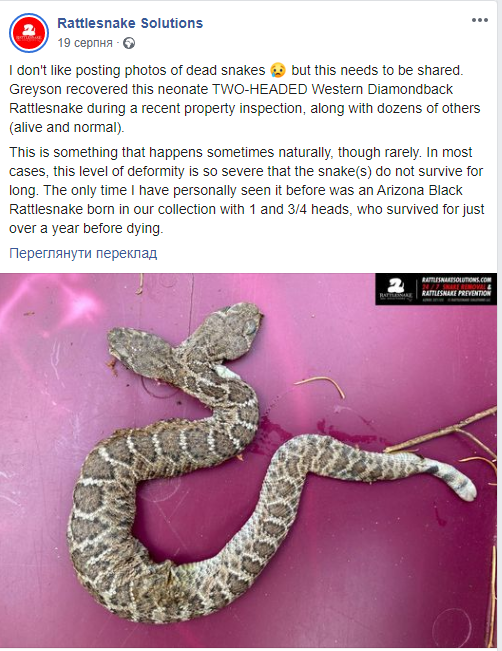 Компанія Rattlesnake Solution, у якій працює Гетті, опублікувала фотографію двоголової змії у соцмережах. На знімку видно коротку, але досить масивну завширшки молоду гримучу змію з двома повністю розвиненими головами.