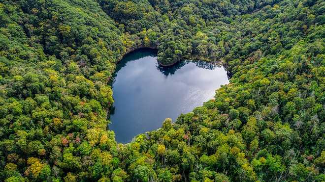 Погляд згори відкриває ідеальну форму серця. Відбиваючи хмари, вода наповнюється синіми відтінками, які розбивають мальовничий зелений масив. А коли пори року змінюються, то озеро оточує помаранчево-червоний краєвид, який довго ховав водойму від людського ока.