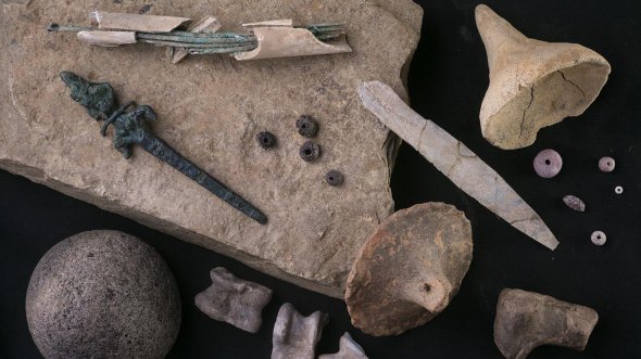 У ході розкопок виявили бронзові голки і статуетки різних божеств, гральні кубики з кісток та залізний кинджал.