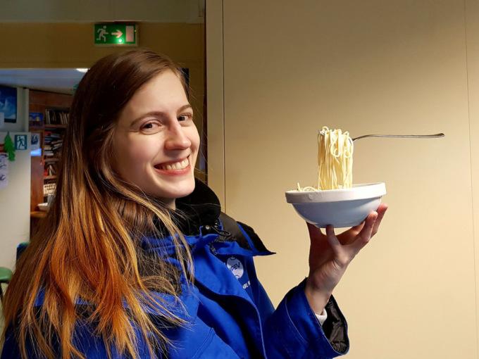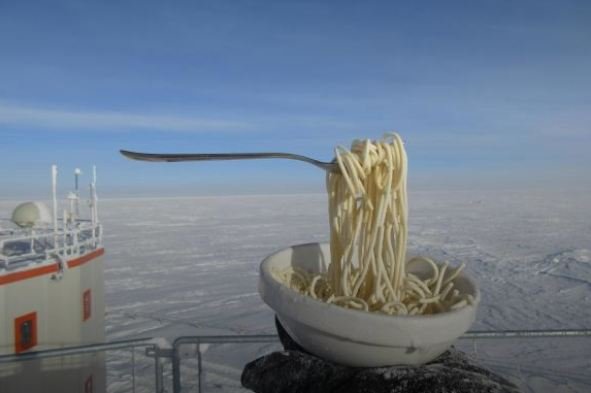 Вчені "Конкордії" приготували їжу, а потім відразу ж залишили її на кілька хвилин на одній з дослідницьких вишок. За межами станції було -60 ℃. Локшина заморозилася за кілька хвилин. Цієї заморозки вистачило ще на кілька знімків вже в приміщенні.