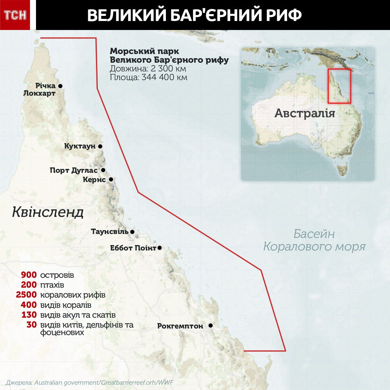 Великий бар'єрний риф – найбільша у світі система коралових рифів. Він простягається вздовж східного узбережжя Австралії, cягає 2300 км завдовжки та від 1981 року входить до переліку Всесвітньої спадщини ЮНЕСКО за свою «надзвичайну важливість для природи та науки». Великий бар'єрний риф є домом для приблизно 25% водного біорізноманіття.