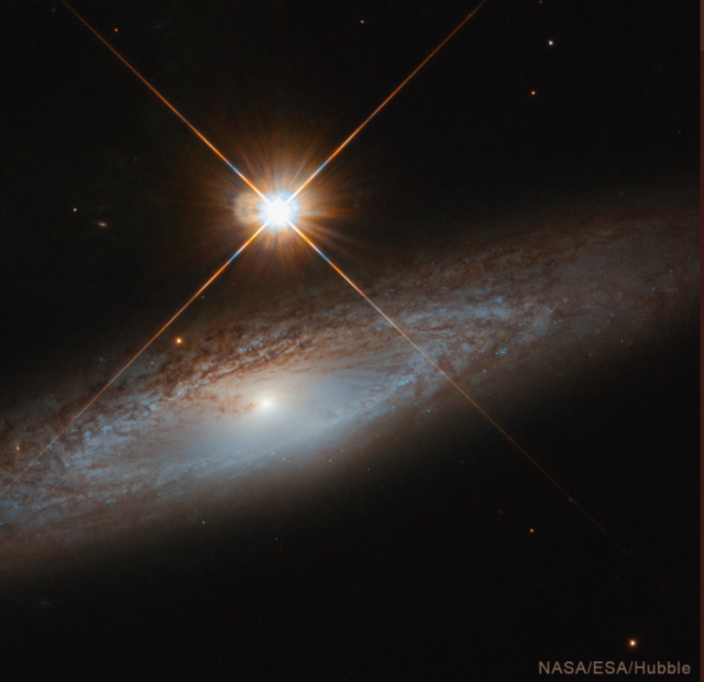Хоча галактика розташована приблизно в 180 мільйонах світлових років від Землі, на світлині можна побачити блискучу зірку, яка насправді розташована набагато ближче до нашої планети. Це створює ілюзію, що сама зірка є величезною.