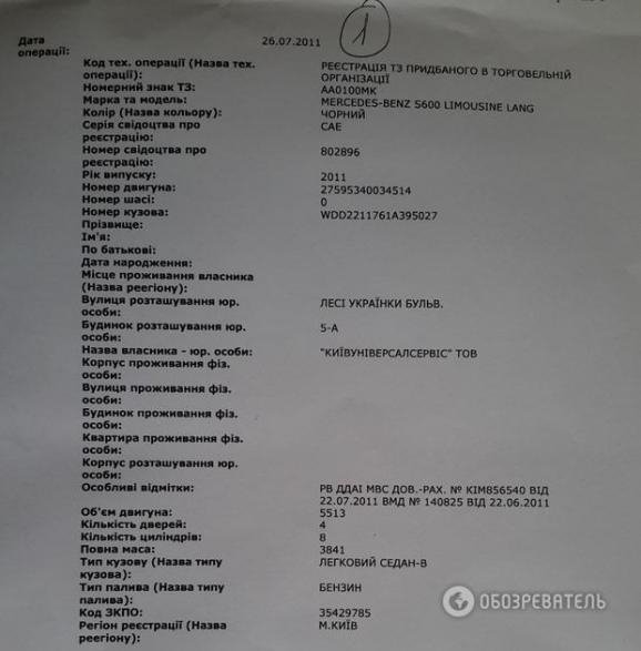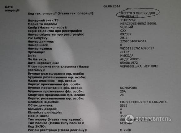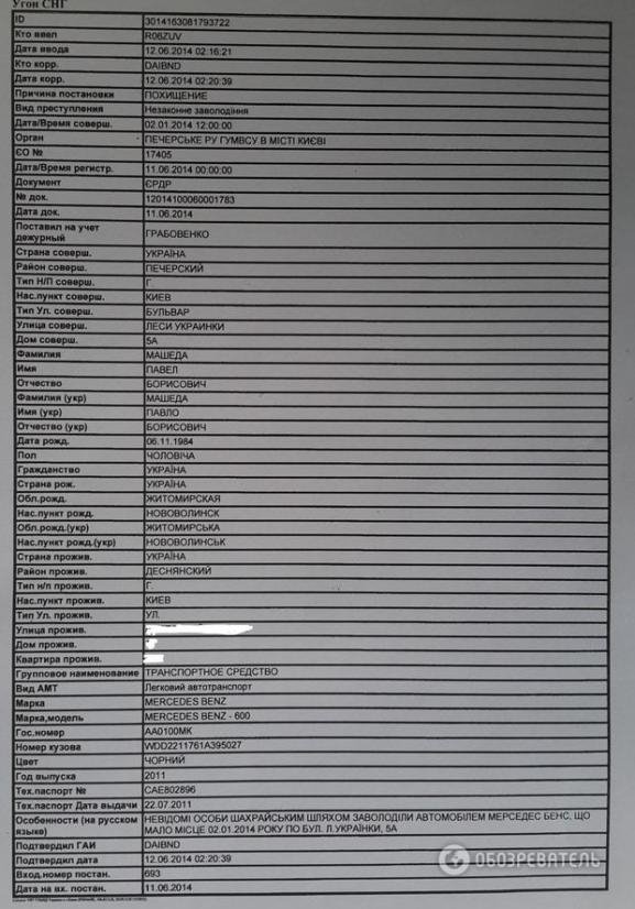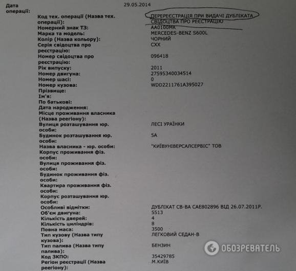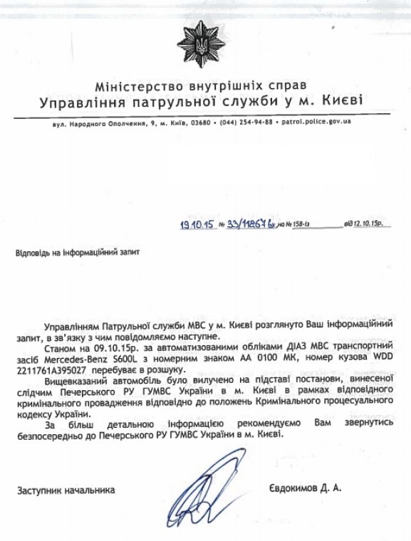 У відповіді на інформаційний запит в Управлінні патрульної служби відповіли, що за автоматизованими обліками ДІАЗ МВС автомобіль Мersedes Benz S600 L з номерним знаком АА 0100 МК, номером кузова WDD 2211761А395027 перебуває у розшуку.