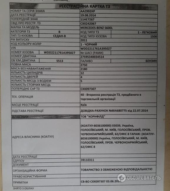 Також ЗМІ стверджують, що влітку 2014 року цей автомобіль отримав нового власника ТОВ "Корнфілд" – компанію, яку пов’язують із оточенням Януковича, і номерний знак АА 2992 КР – тобто такий же, що й на чорному Мersedes, на якому була помічена Тимошенко.
