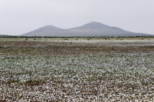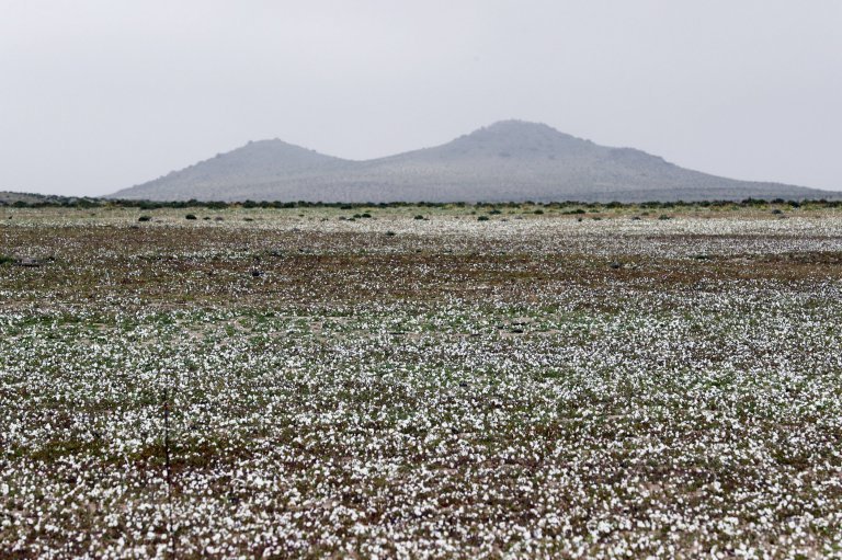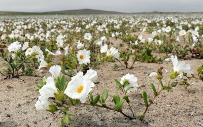 Зараз тут можна спостерігати одночасно цвітіння понад 200 видів рослин. Пустеля Атакама знаходиться на території Чилі. Перуанська течія охолоджує нижні шари атмосфери і створює температурну інверсію, що перешкоджає випаданню опадів (менше 50 мм на рік). Це найпосушливіше місце Землі – протягом чотирьох століть тут не спостерігалося істотних опадів.