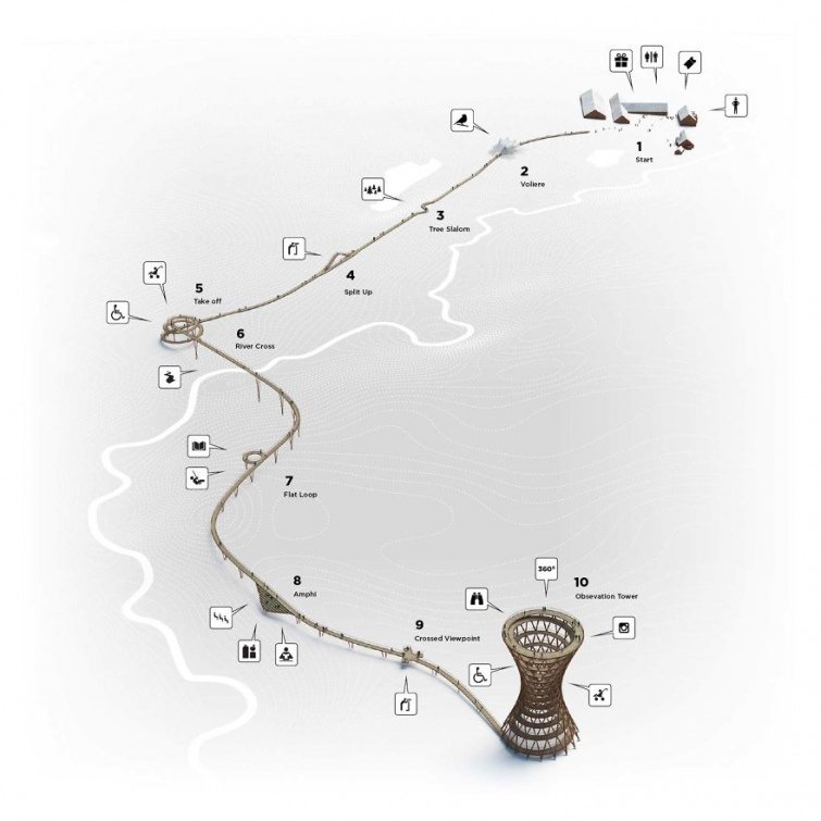 Маршрут частково підвішений на дерева. Високі пішохідні доріжки у районі старих дерев лісу, а нижня стежка проникатиме через молоді райони.