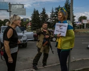 У терористичній "ДНР" жінку, яка підтримує єдину Україну, поставили до "стовпа ганьби". Момент зафіксувало видання The New York Times.