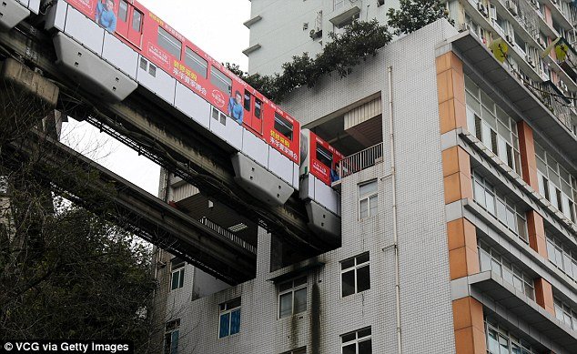 У Чунціні, одному з найбільших за чисельністю населення міст Китаю, одна з ліній монорейки проходить прямо через житловий будинок.
