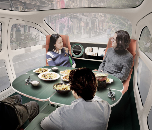 Салон електромобіля спроєктований як багатофункціональна кімната – простір дозволяє тут обідати, працювати, грати і спати. Сидіння обертаються і повністю складаються, утворюючи ліжко. У салоні також є висувний стіл і екран.