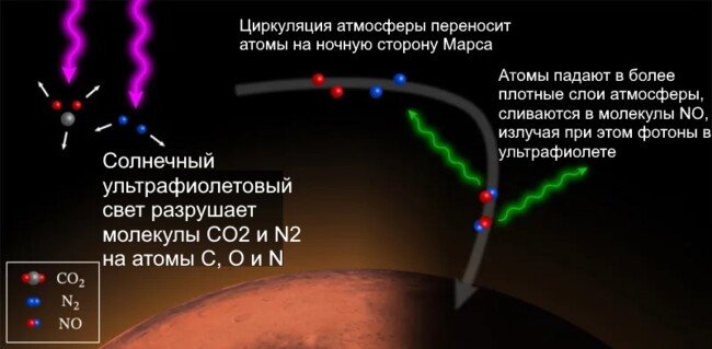 Ці спалахи, відомі як атмосферні припливи, що утворюються в результаті рекомбінації атомів азоту і кисню в нічний мезосфері Марса – середньому шарі між стратосферою і термосферою. За даними космічного агентства, спалахи ультрафіолетового світла виникають, коли вертикальний вітер переносить гази в області з більш високою щільністю, прискорюючи хімічні реакції, які створюють оксид азоту і підсилюють світіння.