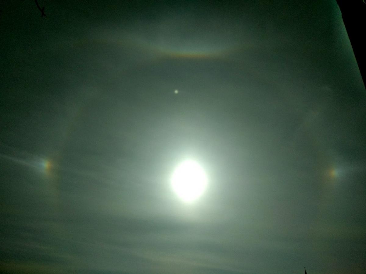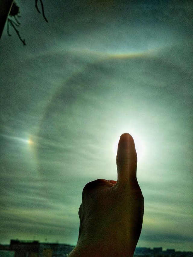"Гало в небі над Харковом 5.04.18!!! Рідкісне атмосферне явище! Але бережіть очі й камери, не спаліть при перегляді і зйомці!", - написав у Facebook харківський астроном Володимир Кожанов і додав, що раніше такі явища в небі сприймали як знамення.