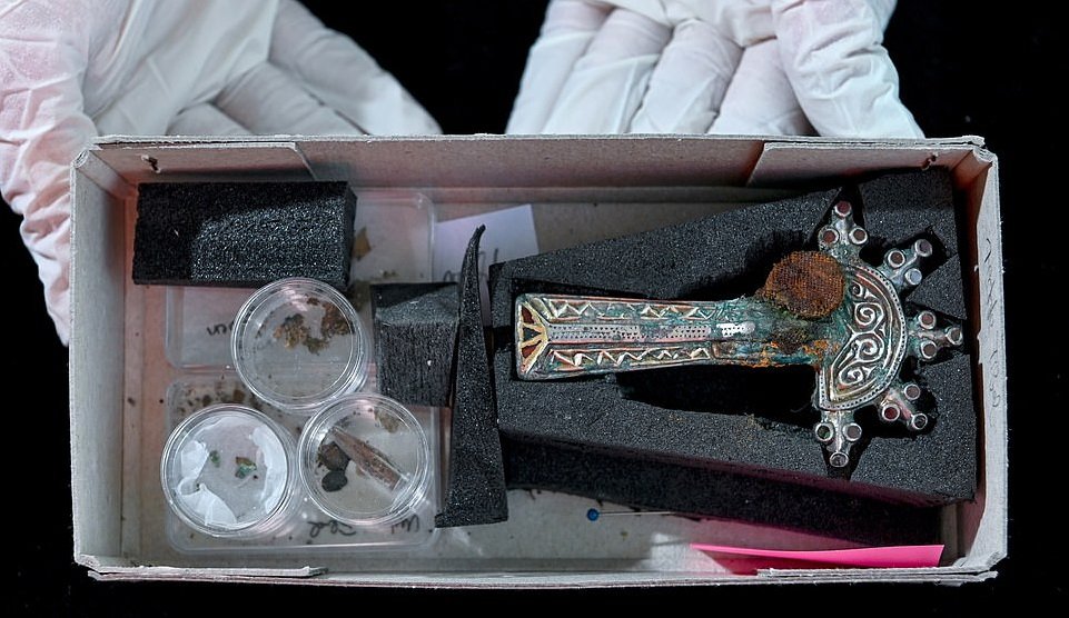 Ця вишукана застібка для одягу знаходиться в майстерні Landesmuseum für Vorgeschichte для подальшого вивчення. Вважається, що затискачі, на яких є шматочки застряглого текстилю, вказують на присутність німецьких племен: лонгобардів, алеманів або тюрингів