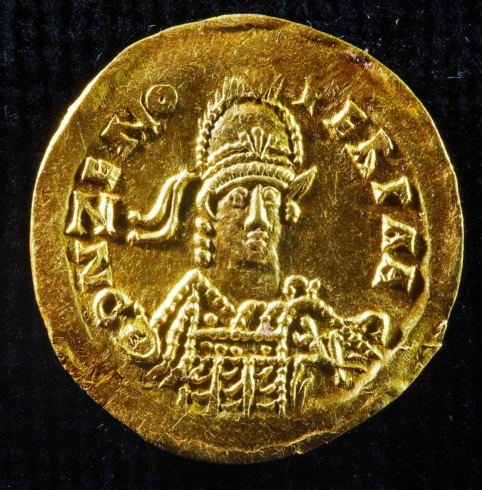 На цій золотій монеті, знайденій на місці поховання, зображено голову східно-римського імператора Зенона, який жив у 480 році
