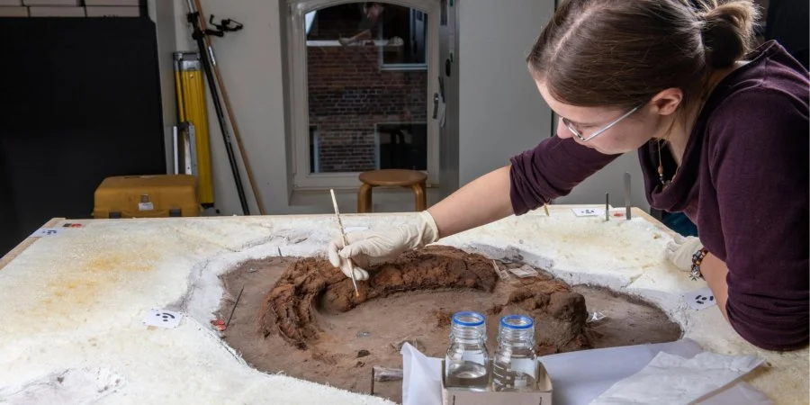 Цей lorica segmentata був виявлений ще в 2018 році. Для того щоб витягти обладунок із землі і вивчити, археологам знадобилося майже два роки. Виявивши під час розкопок під шаром ґрунту великий металевий об’єкт, вони прийняли рішення вирізати з грунту відразу цілий блок вагою в 500 кг, який спочатку попередньо досліджували в аеропорту довколишнього Оснабрюка, використавши рентгенівську аппартуру митниці, а потім вже доставили у Фраунхоферівський інститут для проведення детальної комп’ютерної томографії.