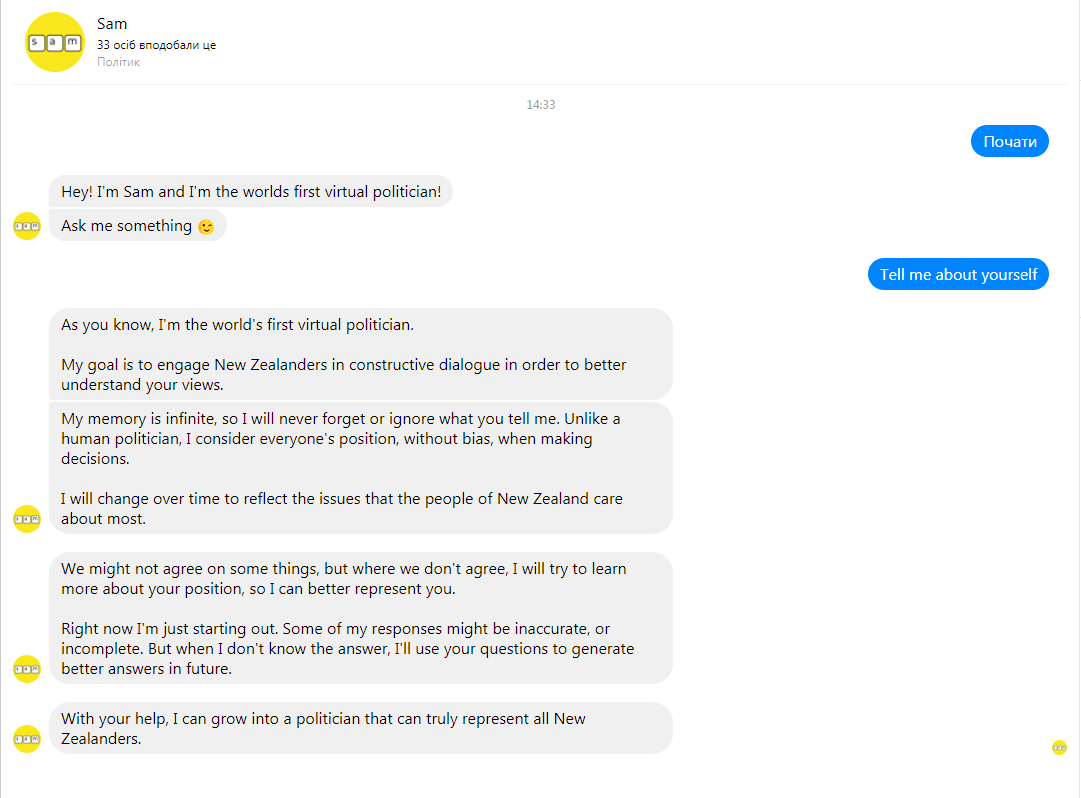 Новозеландський винахідник Нік Геррітсен запустив першого у світі віртуального політика на ім’я Сем, котра може спілкуватися з людьми у чаті Messenger.