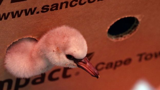 На кадрах, які оприлюднив центр охорони довкілля у Кейптауні, крихітні фламінго радісно плескаються у мисках з водою і час від часу скубуть одне одного.