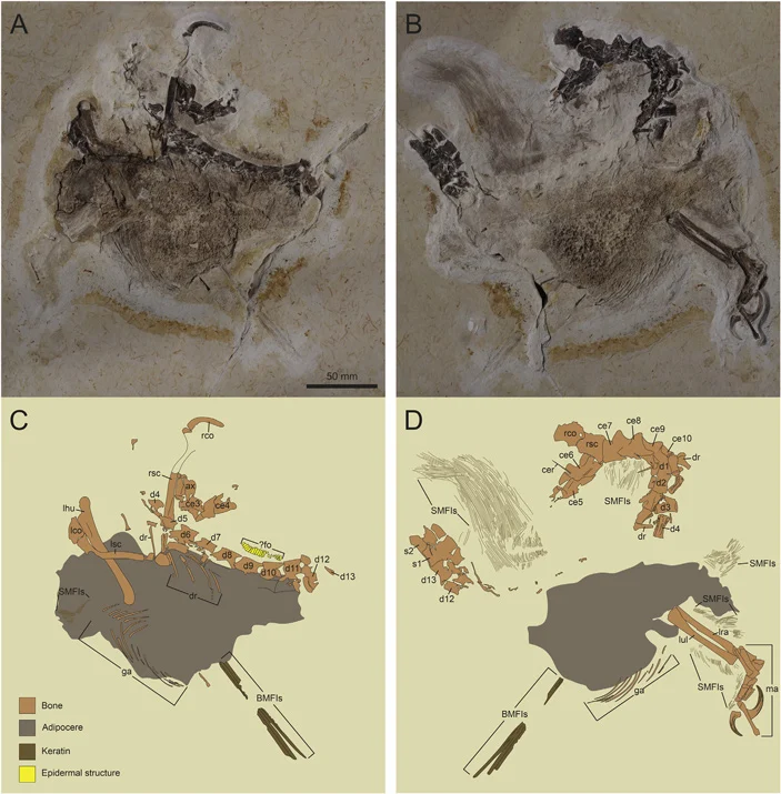 Крім пір’я, відносно добре збереглися й інші деталі анатомії «гривастого» динозавра: шар жировоску (трупного жиру), пір’яні фолікули в області спини і кігтеві пластини на пальцях передніх кінцівок.