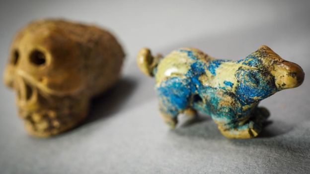 У скрині були кристали, кераміка, аметисти та бурштин. Знайдені скарабеї (обереги у формі священного жука) з Близького Сходу, різні дорогоцінні камені, зокрема сердолік із фігуркою майстра та скляна намистина з рельєфним зображенням голови Діоніса, римського бога вина та родючості.