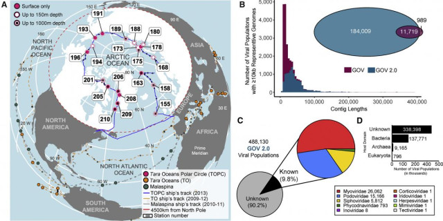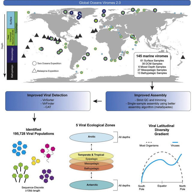 Щоб це виправити, Меттью Салліван з університету штату Огайо і його колеги з 2009 по 2013 роки зібрали 145 проб води з різних глибин у різних частинах Світового океану, включаючи 41 зразок з Арктики. Секвенувавши віроми з цих проб у рамках дослідницького проекту Global Ocean Viromes 2.0, вчені виявили 195728 різновидів ДНК-вірусів, що в 12 разів більше, ніж було відомо до цього в першій версії проекту.