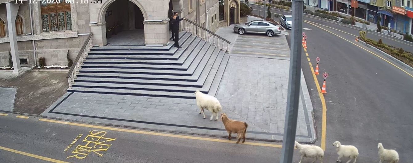 У турецькому Невшехірі стадо із трьох овець, кози та барана намагалося потрапити до будівлі муніципалітету та переслідувало працівників охорони.