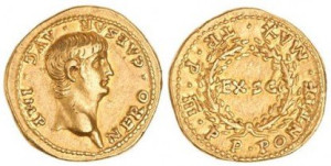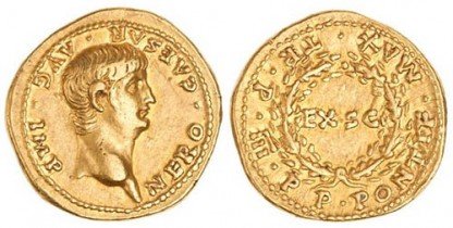Монета називається aureus – це стандартна золота монета Стародавнього Риму, на її лицьовому боці (дивіться фото), зображено портрет Нерона та напис «NERO CAESAR AVG IMP» (Нерон Цезар Август Імператор). Нерон був римським імператором з 54 до 68 р. н.е. На зворотньому боці монети Нерона зображено дубовий вінок, що символізує корону, з літерами «EX SC» («Ех-Senatus Consulto» – за рішенням Сенату»), а також напис» PONTIF MAX TR P III «(Pontifex Maximus Tribunicia Potestas III)