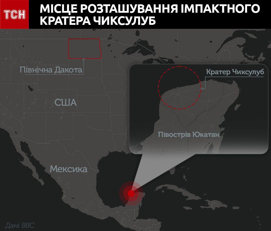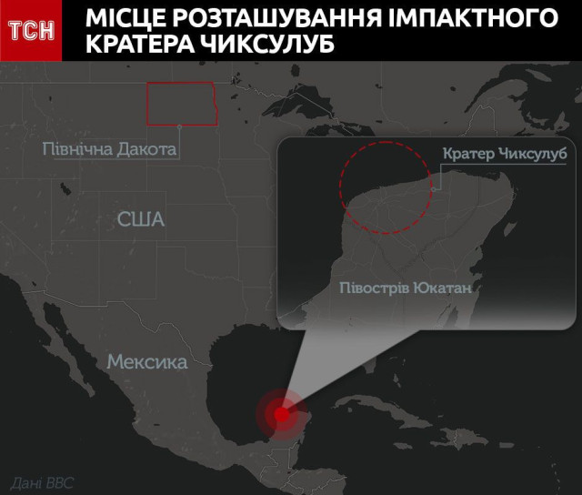 Теорія про знищення динозаврів ударом астероїду має досить вагоме підтвердження – величезний імпактний кратер, розташований на півострові Юкатан. Він має назву Чиксулуб та завширшки понад 150 кілометрів.