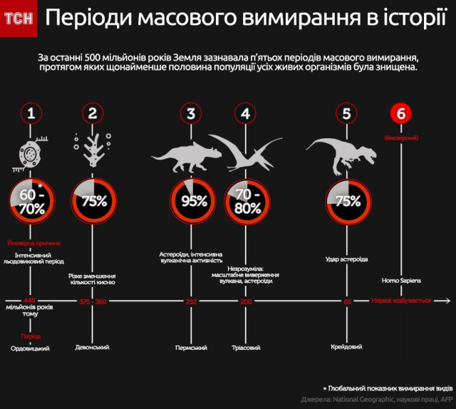 Від часів Кембрійського періоду, який розпочався близько 540 мільйонів років тому, були лише 5 великих періодів вимирання ,що відповідали цим критеріям, пише ТСН. Проте останнім часом точиться усе більше розмов про те, що ще один, шостий період масового вимирання, уже розпочався.