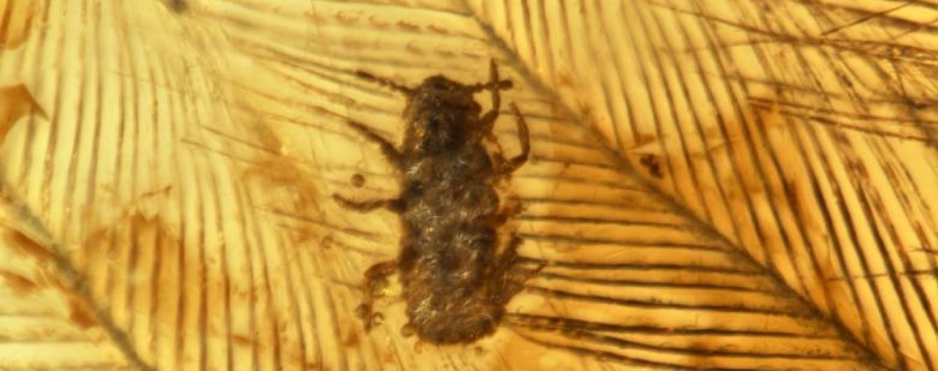 Учені виявили у бурштині раніше невідомих крихітних комах, схожих на сучасних вошей, разом з пером динозавра.