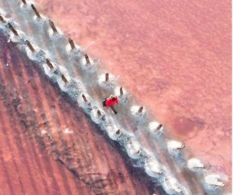 «Коли вперше бачиш Рожеве озеро в Херсонській області, то здається, ніби потрапив на іншу планету. Влітку мікроскопічні водорості забарвлюють воду в рожевий та червоний кольори. Знайти місце, звідки можна подивитися на озеро зверху, майже неможливо, тому я вирішив використовувати дрон», – розповів фотограф.