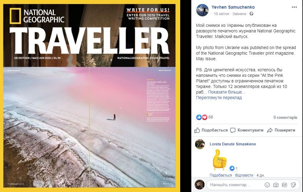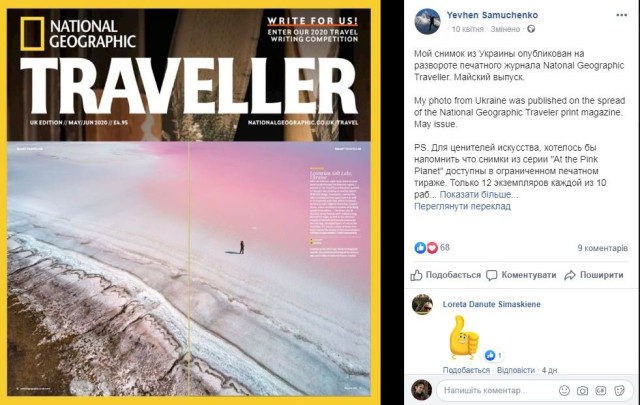 «Мій знімок з України опублікований на розвороті друкованого журналу National Geographic Traveller. Травневий випуск», – написав Самученко на своїй сторінці в Facebook.