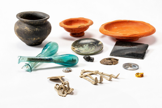 Найбільшу кількість артефактів знайшли в найрозкішнішій з гробниць. Всього з неї археологи витягли понад два десятки різних предметів, зокрема керамічні вази, кілька скляних флаконів, два бронзових дзеркала, залишки трубки, в яку був вкладений згорнутий пергамент, золоте кільце і унікальний набір свинцевих мініатюр.