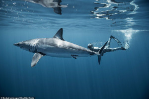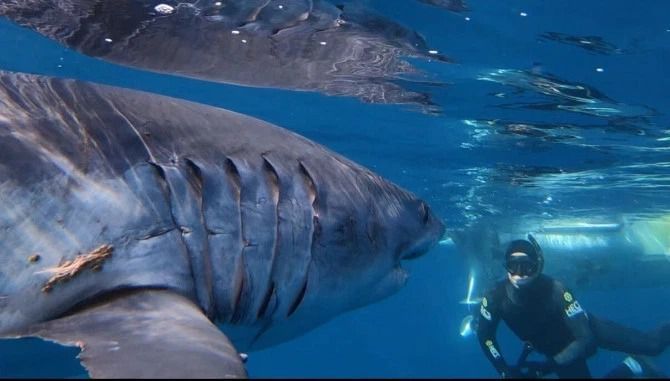 На знімках видно, як 4-метрова акула пропливає всього в декількох сантиметрах від безстрашного дайвера. Відчайдушний пірнальник вважає, що близький контакт заспокоює зубастих хижаків. Він порівнює таке заняття зі спілкуванням з крутими хлопцями в пабі.