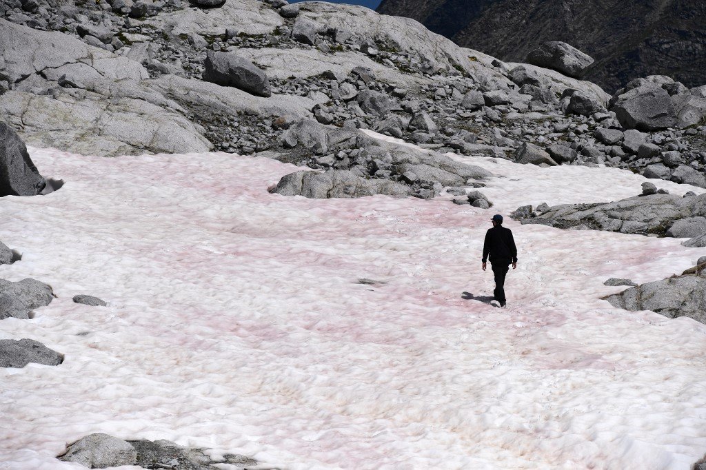 У міру того, як швидко лід тане, з’являється більше водоростей, які дають життєво важливу воду і повітря і додають червоні відтінки до білого льоду в Пассо Гавія на висоті 2618 метрів. За словами дослідника, все, що затемнює сніг, змушує його танути.