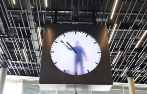 Дивлячись на годинник, здається ніби кожну хвилину хтось стирає і заново малює стрілки. Насправді, це 12-годинне відео, яке відтворюється по колу. Благо годинник показує реальний час, інакше пасажири постійно запізнювалися б на свій рейс. Хоча тут і так можна задивитися.