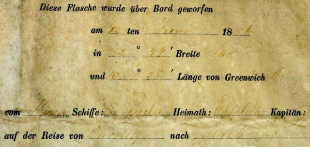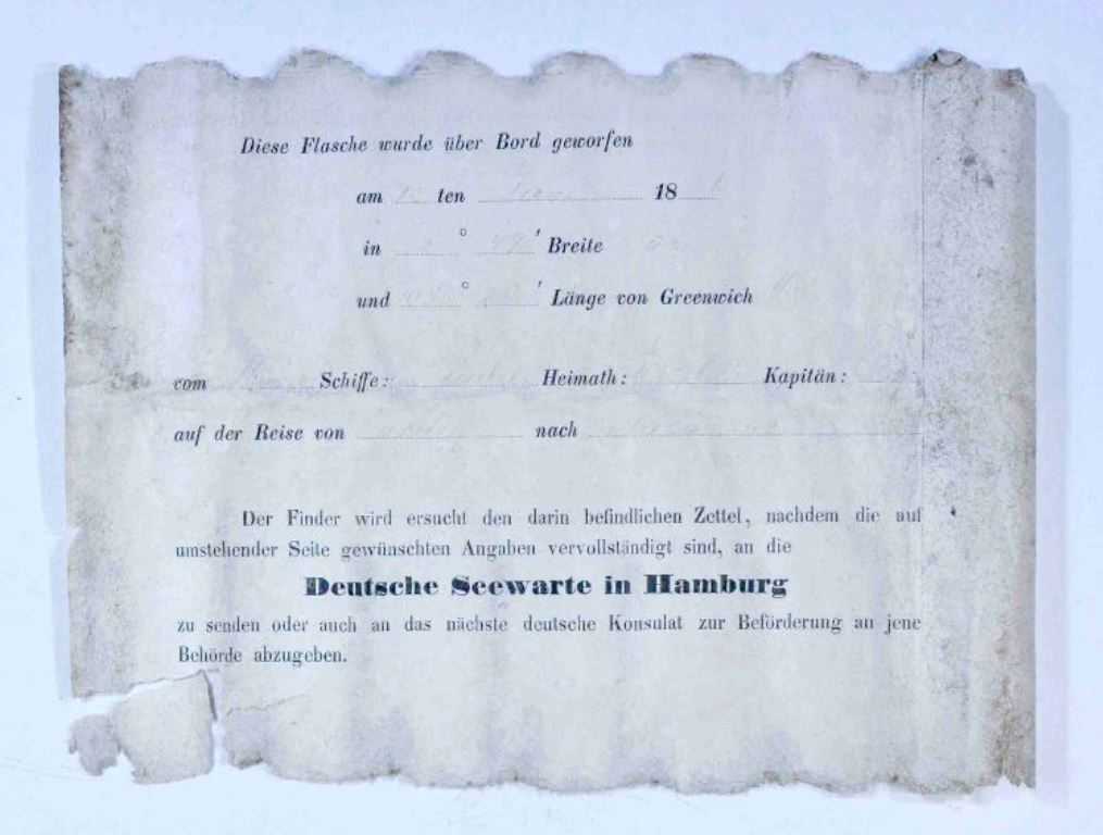 Пляшку із запискою викинули в Індійський океан 12 червня 1886 року з німецького вітрильного судна Паула.