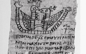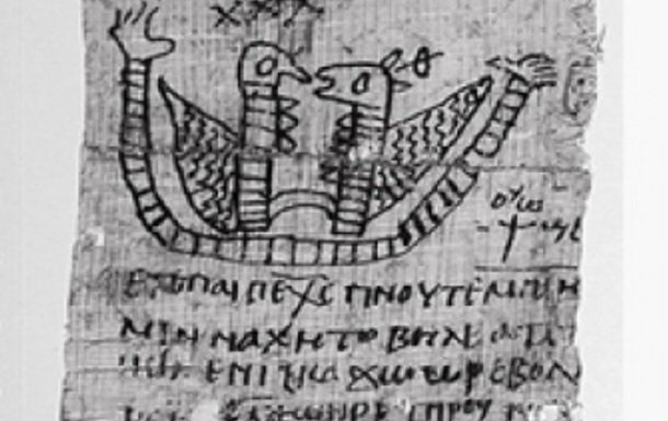 На малюнку зображено двох схожих на птахів істот, а під ними - напис коптською мовою, що була поширена в елліністичному Єгипті. Алфавіт її заснований на грецькій системі письма.