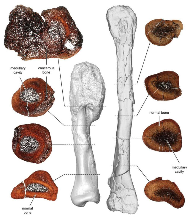 Остеосаркома – це злоякісний рак кісток, який вражає близько тисячі американців на рік, особливо підлітків. Після розгляду трьох альтернативних пояснень, команда дійшла висновку, що динозавр перебував в такому ж стані.
