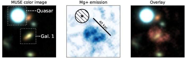 Виявилося, що астрономи недорахувалися до 90% баріонної матерії у галактиках. Згідно з моделями, ця речовина була витіснена зоряним вітром, який утворювався через вибухи наднових зірок. Тобто більшість звичайної речовини Всесвіту має перебувати за межами галактик. І якщо раніше це було лише припущення, то тепер з’явилися спостережні дані від Дуже великого телескопа (Very Large Telescope, VLT).Зліва: демаркація квазара та галактики, які вивчалися; центр: туманність та шкала розмірів; справа: накладення туманності та галактики