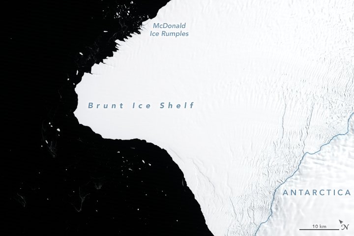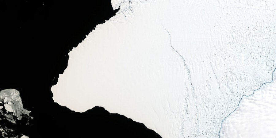 Тріщина вздовж верхньої частини зображення від 23 січня 2019 року - так звана Гелловінська тріщина - вперше з'явилася в кінці жовтня 2016 року і продовжує рости на схід. Більш серйозна проблема - тріщина в центрі зображення. Раніше ця тріщина залишалася стабільною близько 35 років, а нещодавно почала зростати на північ зі швидкістю 4 кілометри на рік.