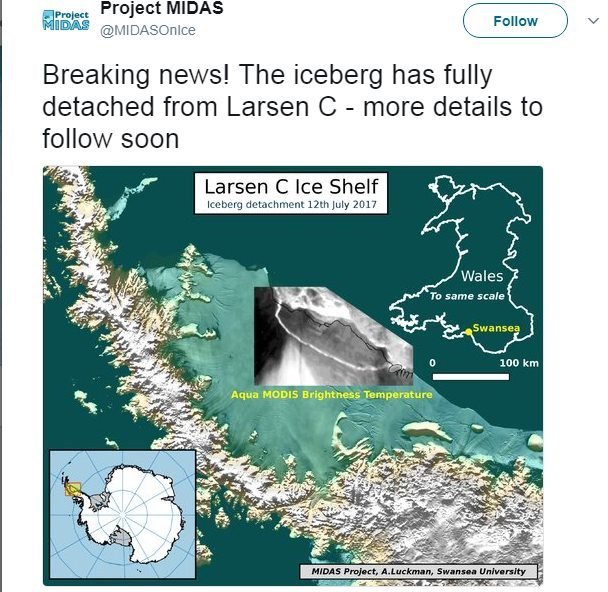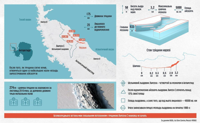 "У нас немає жодних доказів того, що ця подія пов'язана зі зміною клімату. І хоча загальне руйнування шельфового льодовика в південному напрямку на Антарктичному півострові вважається наслідком глобального потепління, ця тріщина зародилася давно й прогресувала десятками років, тож її причини радше природні", — йдеться в заяві науковців на сайті Project MIDAS.