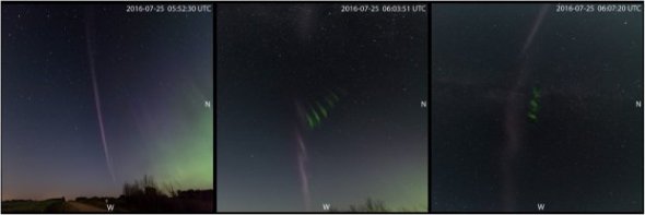 Так, канадський астрофотограф-любитель Нотані Бурасса у липні 2016-го знімав незвичайне полярне сяйво. Зйомка тривала 19 хв. У цей момент світіння фіксували наземні камери All-Sky Imagers, фотометри Meridian Scanning Photometers і апарат Swarm. Із землі пристрої зафіксували тонку дугу фіолетово-білого кольору і нестійку зелену структуру.