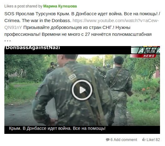 "В Донбассе идет война. Все на помощь! Призывайте добровольцев из стран СНГ.! Нужны профессионалы! Времени не много с 27 начнётся полномасштабная война. Пока открыта часть границы. Пусть идут все кто против фашизма."
