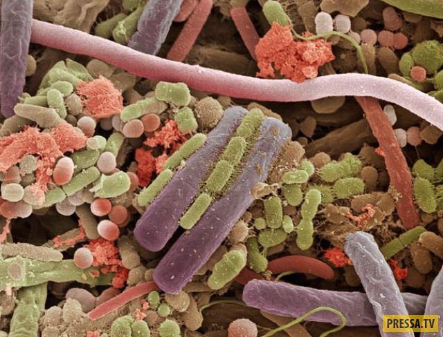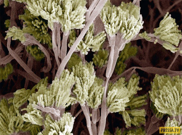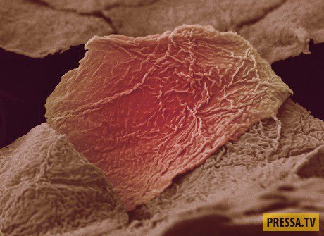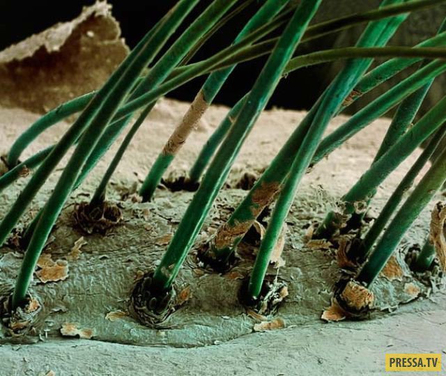 Завдяки електронному мікроскопу вченим вдалося розглянути структуру частин тіла людини та мікроорганізмів, що живуть на ній. Тканини збільшені у 18 тис разів.